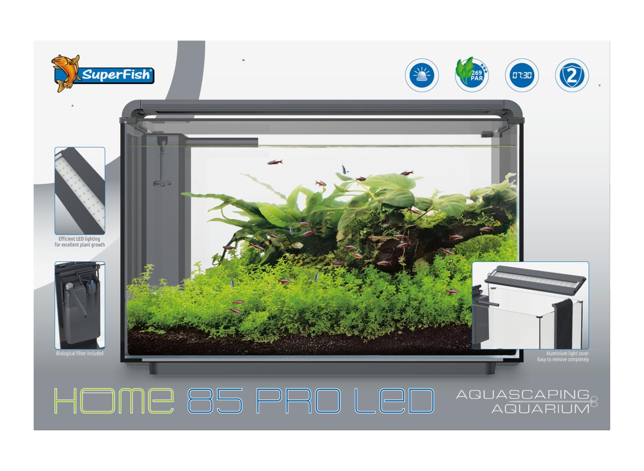 Die SuperFish Home PROLED Design-Aquarien sind ein Blickfang in jedem Raum, vom Wohnzimmer über die Küche bis zum Büro. Diese Plug-and-Play-Aquarien sind einfach zu installieren und zu warten. Die Home-Aquarien verfügen über eine innovative LED-Beleuchtung, einen integrierten Innenfilter mit leicht auswechselbarer Filterpatrone und eine elegante Abdeckplatte, die verhindert, dass Fische aus dem Aquarium springen.