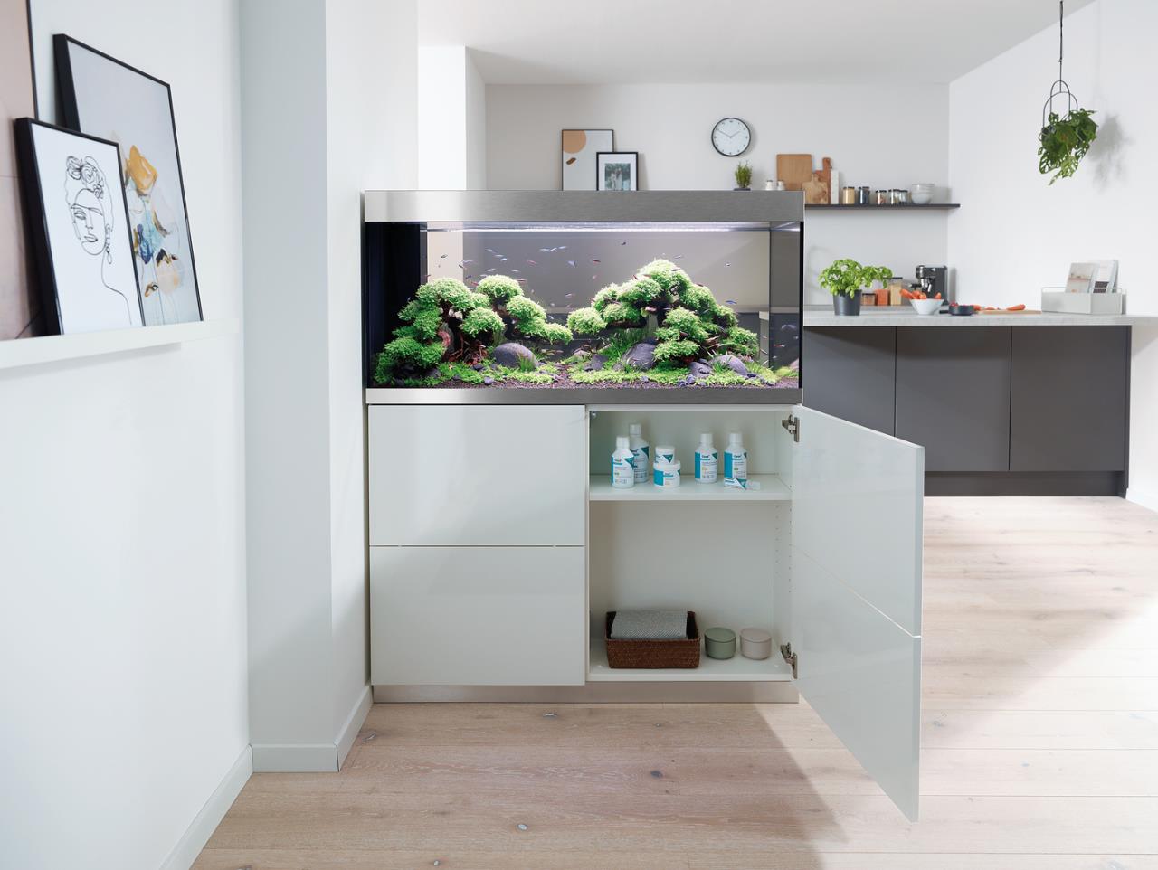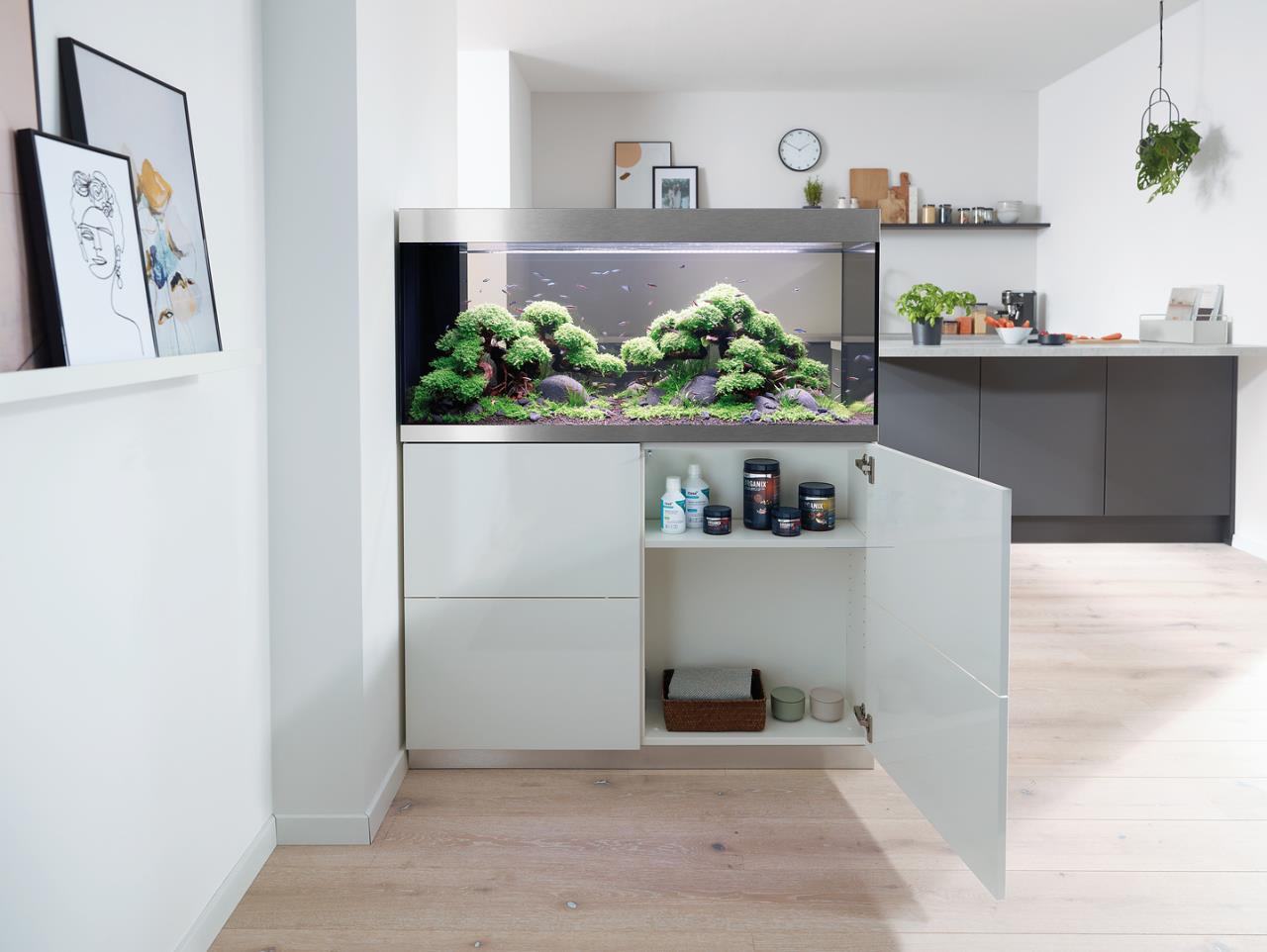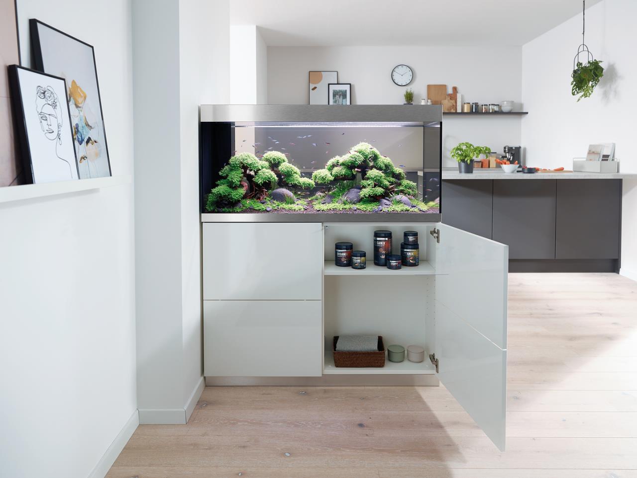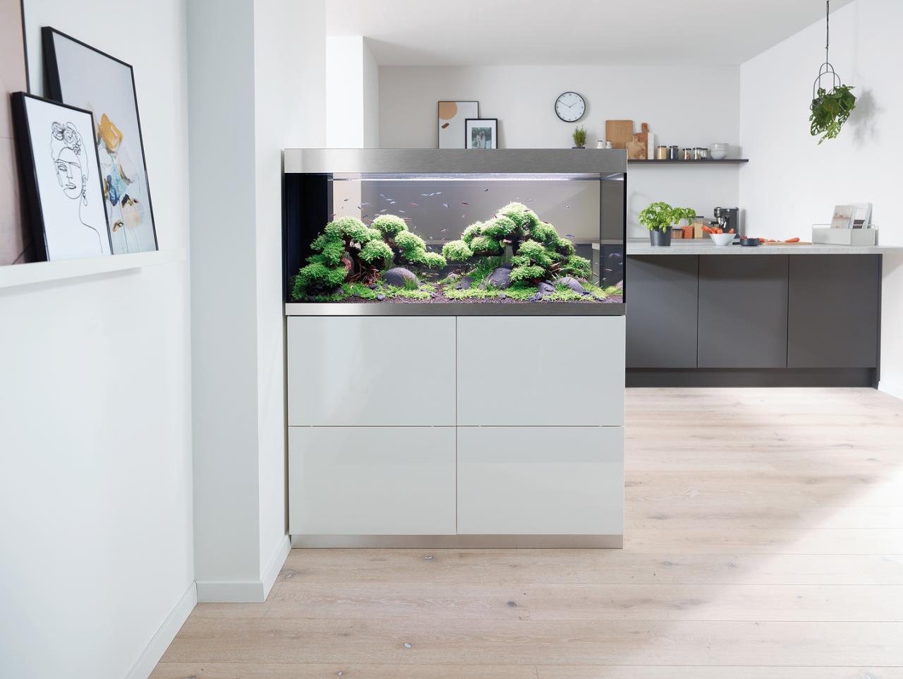 Die moderne Aquarienkombination HighLine Raumteiler Weißglas 300 weiß ist so konzipiert, dass sie als Raumteiler genutzt werden kann: Der geschickt integrierte Trockenschacht für Kabel und Schläuche liegt an der kurzen Seite, der passende Unterschrank hat auf beiden langen Seiten grifflose Türen mit Push-to-open-Funktion. Dank der eleganten, modernen Linienführung lässt sich das Aquarium in jede Wohnsituation integrieren. Das Glas ohne Grünstich sorgt für eine gute Farbwiedergabe der Tiere und Pflanzen. Gebürstete Alublenden oben und unten verbergen Kalk- und Schmutzränder. Nichts lenkt von der schönen Unterwasserwelt im Aquarium ab. Der von beiden Seiten zugängliche Unterschrank bietet viel Platz für Zubehör und Aquarientechnik. Der ausziehbare Regalboden lässt sich individuell ausrichten: Je nach Bedarf kann er in eine beliebige Richtung ummontiert werden und sorgt so für eine komfortable Filterreinigung.