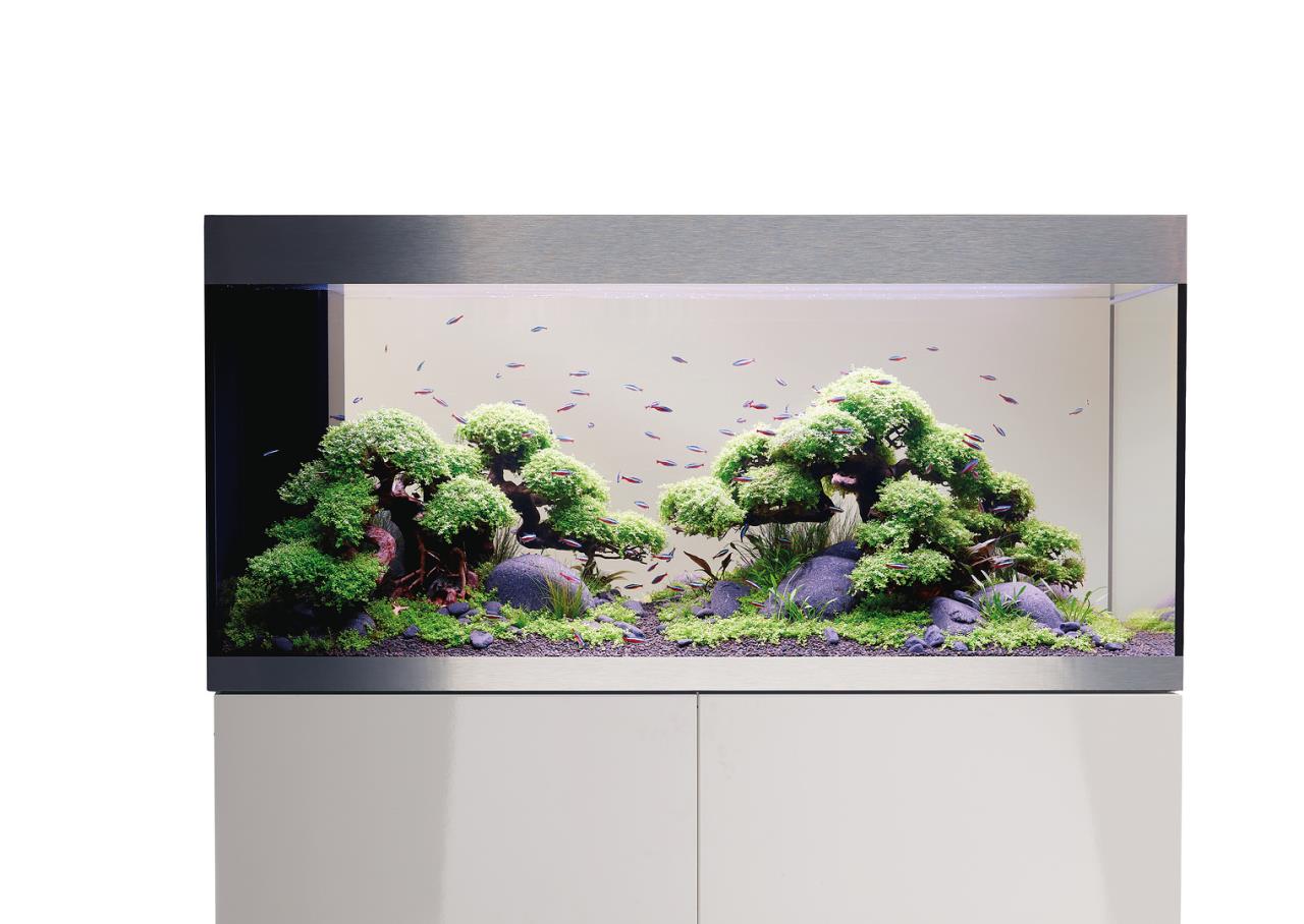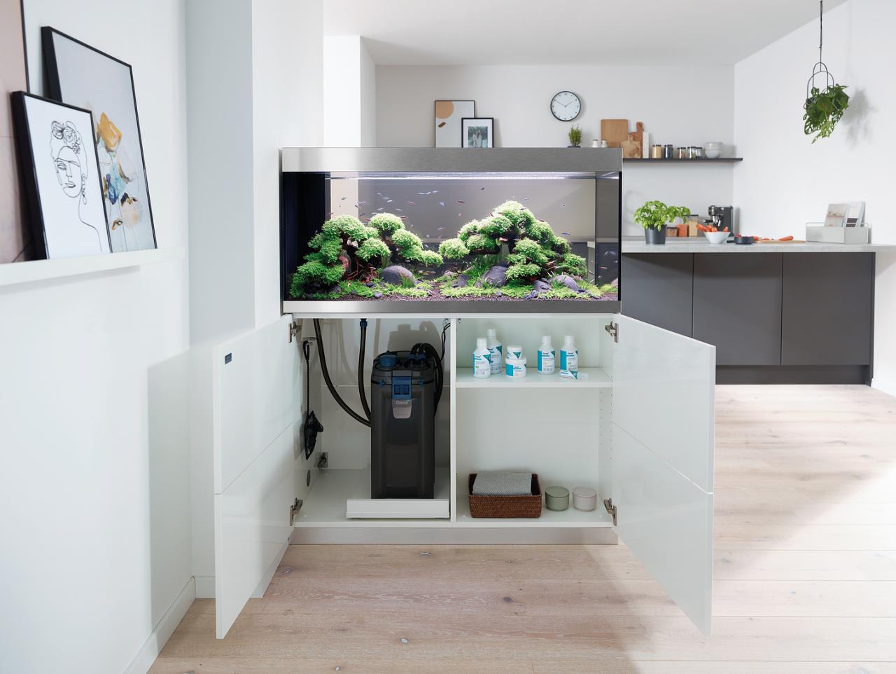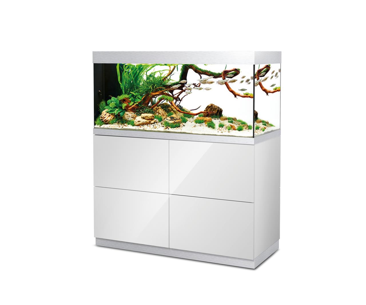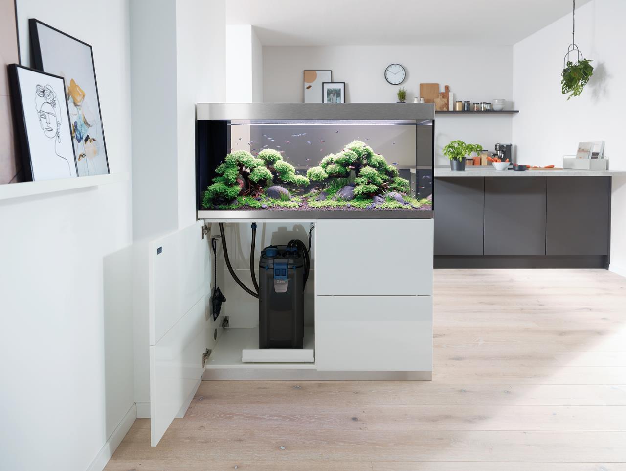 Die moderne Aquarienkombination HighLine Raumteiler Weißglas 300 weiß ist so konzipiert, dass sie als Raumteiler genutzt werden kann: Der geschickt integrierte Trockenschacht für Kabel und Schläuche liegt an der kurzen Seite, der passende Unterschrank hat auf beiden langen Seiten grifflose Türen mit Push-to-open-Funktion. Dank der eleganten, modernen Linienführung lässt sich das Aquarium in jede Wohnsituation integrieren. Das Glas ohne Grünstich sorgt für eine gute Farbwiedergabe der Tiere und Pflanzen. Gebürstete Alublenden oben und unten verbergen Kalk- und Schmutzränder. Nichts lenkt von der schönen Unterwasserwelt im Aquarium ab. Der von beiden Seiten zugängliche Unterschrank bietet viel Platz für Zubehör und Aquarientechnik. Der ausziehbare Regalboden lässt sich individuell ausrichten: Je nach Bedarf kann er in eine beliebige Richtung ummontiert werden und sorgt so für eine komfortable Filterreinigung.