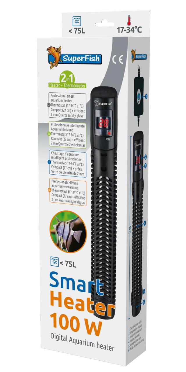 Professionelle intelligente Heizung und Thermometer in einem. Kompakt und effizient mit einer präzisen digitalen Temperaturregelung. Die Länge der 100, 200 und 300 Watt Heizung ist nur 27 cm, die 500 Watt Heizung ist 30 cm lang. Nach der Einstellung der gewünschten Wassertemperatur auf der digitalen Anzeige wird die aktuelle Temperatur angezeigt und das Aquarienwasser aufgeheizt. Das genaue und zuverlässige Thermostat (17-34°C) hält eine konstante Wassertemperatur. Das 2 mm Quarz-Sicherheitsglas und die Kunststoff-Schutzkappe sorgen für sicheren Gebrauch.