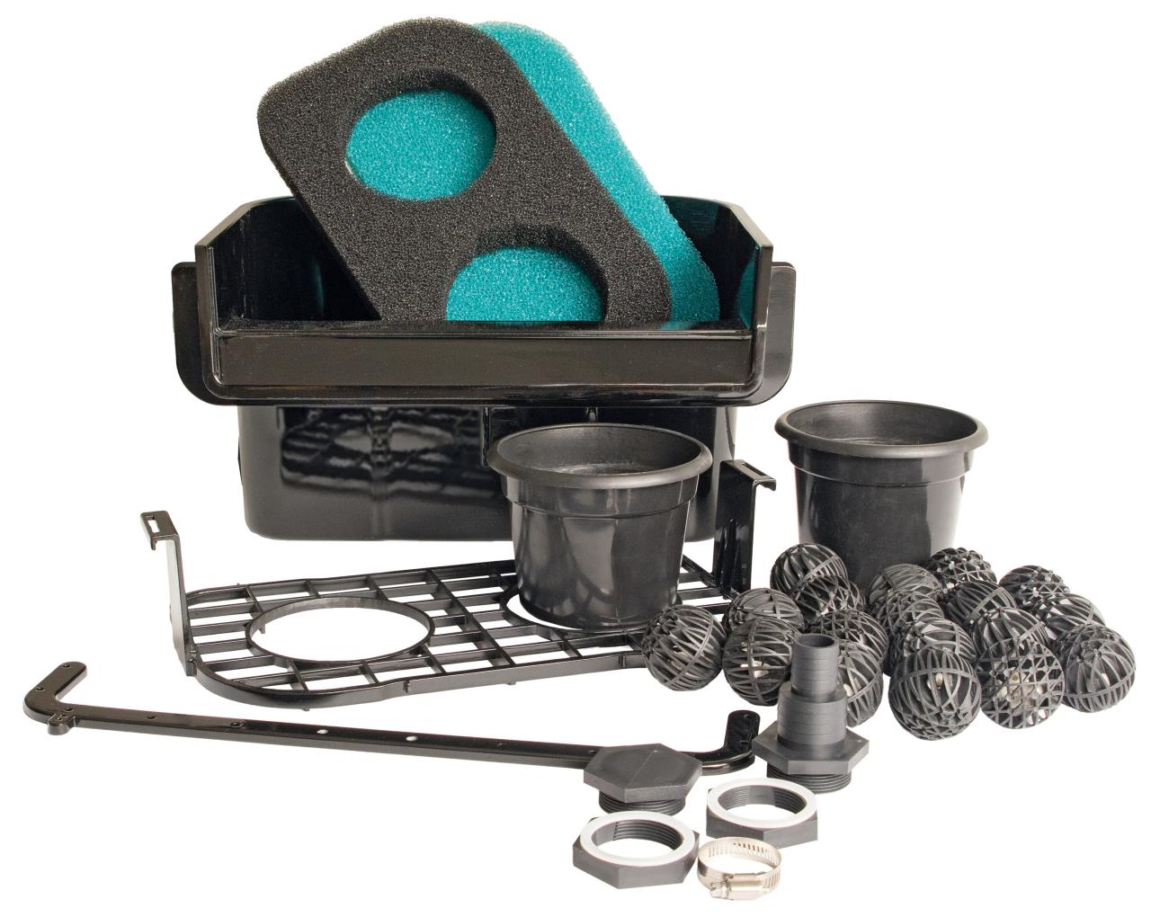2-in-1-Wasserfall und Teichfilter mit Pflanzen, komplett mit Filtermedien, 2 Pflanztöpfen und Zubehör für eine einfache Installation. Dieser praktische Wasserfall bringt Leben in den Teich und fungiert gleichzeitig als Teichfilter.
